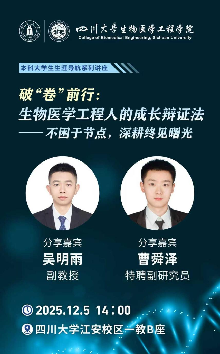 12月5日,首场讲座面向大二年级学生举行,主题为“破‘卷’前行:生物医学工程人的成长辩证法——不困于节点,深耕终见曙光”。学院副教授吴明雨与特聘副研究员曹舜泽以“过来人”身份,结合自身求学、科研与生活经历,与同学们展开深度交流。
