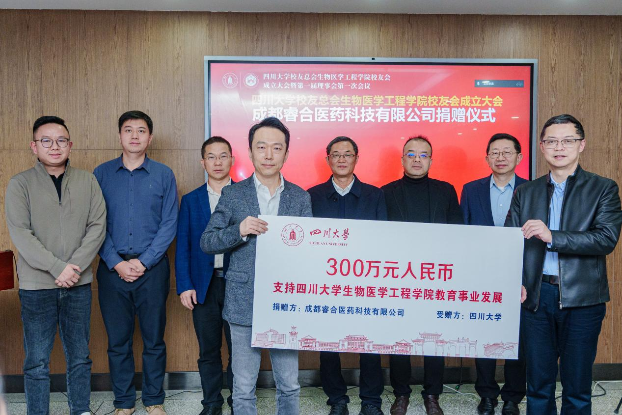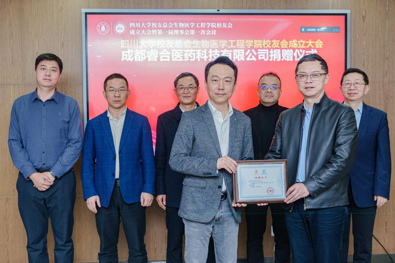 在学院校友会成立大会上,举行了成都睿合医药科技有限公司捐赠仪式。该公司依托生物材料研发与产学研协同优势,打造了菲林普利等高端医美品牌,并于2024年6月,与学院签署科研与产业转化战略合作协议,携手共建联合实验室,开展前沿技术协同研发。此次捐赠,正是双方战略合作的进一步深化,必将为学院发展注入新的活力。学校领导向企业代表颁发了捐赠证书,并对企业支持教育的善举表示衷心感谢。