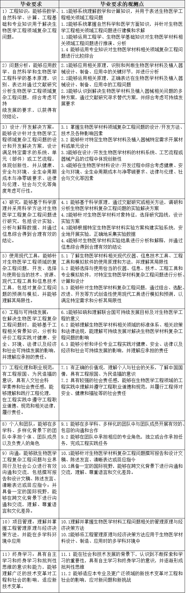 1)知识:能够运用生物医学材料的专业知识、工程技能和现代工具,具备研究与解决生物医学材料及植入器械复杂工程问题的能力;(对应毕业要求:125